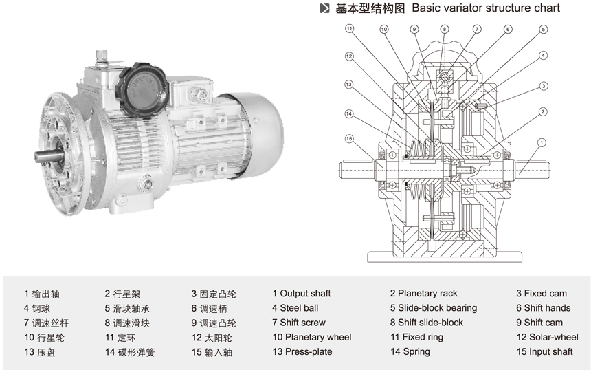 MB無級變速機基本結構圖有15個方面介紹:1、輸出軸 2、行星架 3、固定凸輪 4、鋼球 5、滑塊軸承 6、調速柄 7、調速絲桿 8、調速滑塊 9、調速凸輪 10、行星輪 11、定環 12、太陽輪 13、壓盤 14、碟形彈簧 15、輸入軸